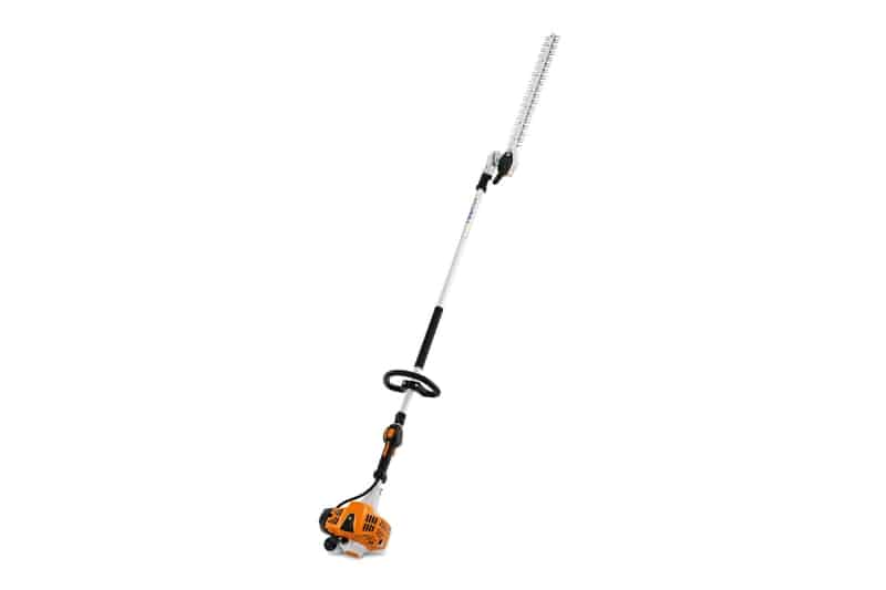 The New STIHL HL 94 HEDGE TRIMMER (Model HL 94) is a professional-grade, gasoline-powered long-reach hedge trimmer within the Long-Reach Hedge Trimmers category, engineered for maximum efficiency and comfortable operation on tall, long, and wide hedges. This powerful unit is driven by a 24.1 cc (1.5 cu. in.) STIHL 2-MIX engine that delivers 0.9 kW (1.2 bhp) of engine power while meeting strict emission standards. Designed for precision, the HL 94 features 24″ (60 cm) dual-ground, double-sided cutting blades with a tooth spacing of 34 mm, capable of powerfully cutting through thicker branches. The highly maneuverable 145° articulating cutting head offers 13 locking positions, allowing for a wide range of blade adjustment to reach awkward angles, and it folds flat parallel to the shaft for compact transport and storage. For optimized performance during long shifts, the multi-function control handle includes the STIHL ECOSPEED partial-load function, which allows the operator to regulate engine speed with a variable throttle wheel to reduce noise and fuel consumption. Effortless starting is ensured by the STIHL ErgoStart (E) system, which halves the force required to pull the starter cord, combined with a manual fuel pump (primer) for a simplified starting procedure. This lightweight unit features a reduced-weight transmission, an integrated anti-vibration system to protect the operator, and a large loop handle for superior support and control in confined spaces. With an overall length of 242 cm (95.3 in.), the HL 94 provides an extended reach of up to five feet, making it the ideal choice for professional landscape maintenance and demanding residential work.