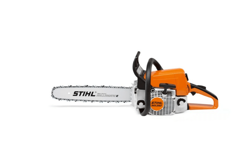 The New STIHL MS 250 CHAINSAW (Model MS 250) is a lightweight and powerful gas-driven chainsaw within the Occasional Use category, specifically designed for felling small trees, cutting firewood, and cleaning up around the property. Engineered with an incredible power-to-weight ratio, this unit is powered by a 45.4 cc (2.8 cu-in) engine delivering 2.3 kW (3.1 bhp) of engine power. For enhanced operator comfort during extended tasks, it features the STIHL anti-vibration system, which uses buffer and spring elements to reduce the transmission of engine vibrations to the handles, protecting your muscles and joints. The MS 250 is equipped with a Master Control Lever—a single lever that manages the choke, starting throttle, and on-off switch for simplified and reliable starting. For added convenience, it features a side-access chain tensioner for easy adjustments and tool-less fuel and oil caps with a bayonet closure for quick refilling without the need for additional tools. This model also includes a Winter/Summer Shutter, allowing the carburettor to operate in a warm air intake mode during winter to prevent icing, and an electronic ignition system for a stable spark and trouble-free engine running.