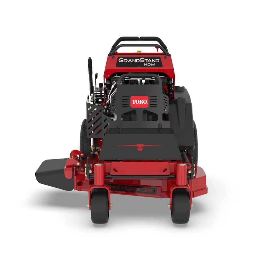 The Toro 74535 GrandStand® HDM 36″ stand‑on mower blends the agility of a walk‑behind with the performance and comfort of a zero‑turn unit. Powered by an 18.5 hp Kawasaki® FS600V 603 cc engine with electric start, it features a 36″ fabricated steel deck designed for robust cutting coverage and efficient mowing. The stand‑on platform with twin‑lever steering gives excellent maneuverability, while the rear‑wheel‑drive system and larger turf tires help maintain traction across varied terrain. This model includes a heavy‑duty welded steel frame, rubber discharge chute, and easy‑access service points like a flip‑up hood to simplify maintenance.